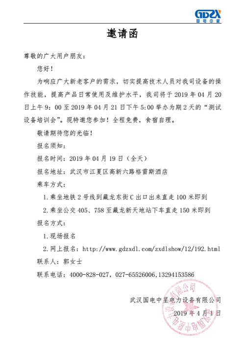國電中星測(cè)試設(shè)備培訓(xùn)會(huì)邀請(qǐng)函為響應(yīng)廣大新老客戶的需求,切實(shí)提高技術(shù)人員對(duì)我司設(shè)備的操作技能,提高產(chǎn)品日常使用及維護(hù)水平,我司將于2019年4月20日-21日舉辦為期2天的“測(cè)試設(shè)備培訓(xùn)會(huì)”,歡迎大家積極報(bào)名參加!