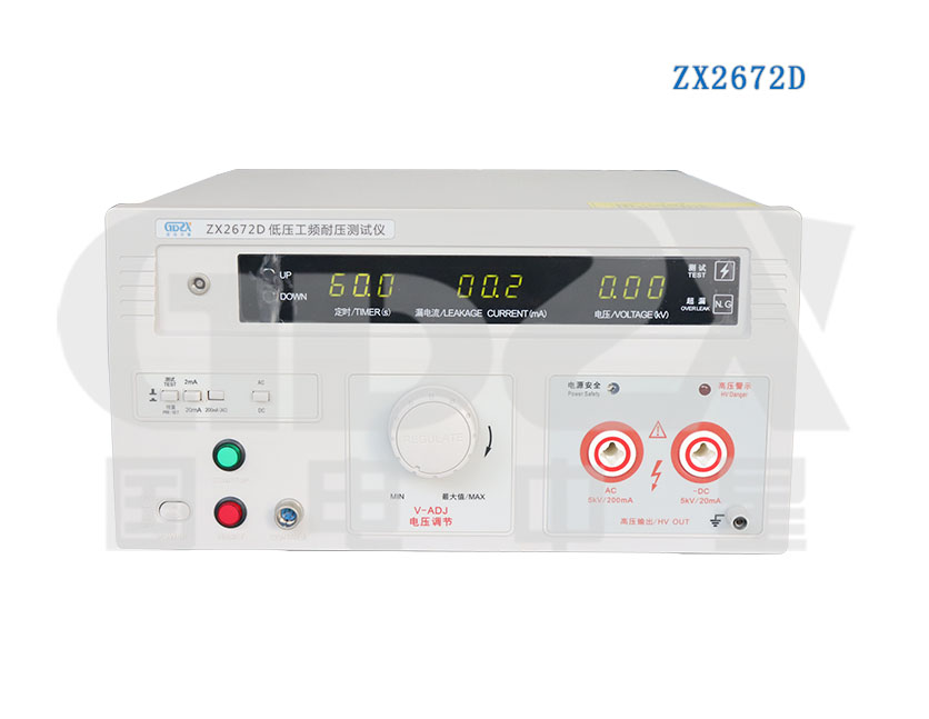 ZX2672D輸出電壓為5kV,測(cè)試電流為交流200mA,直流為20mA的交直流耐壓測(cè)試儀