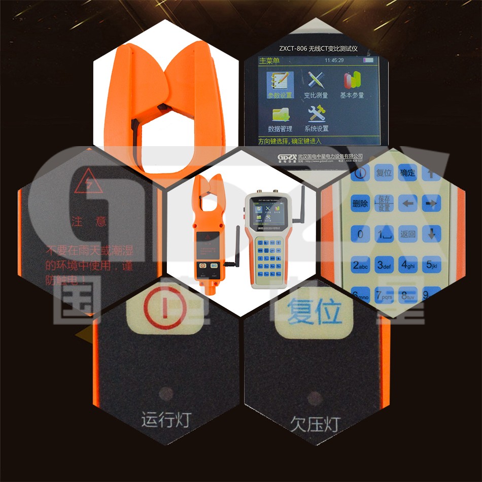 ZXCT-806無線CT變比測試儀是本公司憑借生產(chǎn)智能化儀表的多年經(jīng)驗積累,適應(yīng)用戶現(xiàn)場需求而推出的。主要用于高壓變壓器(或互感器)兩側(cè)電力參數(shù)的測量??蓪崿F(xiàn)一路二次側(cè)電壓,一路一次側(cè)電流和一路二次側(cè)電流的同時測量,顯示幅值、變比,變比誤差,相角(各路信號之間),功率因數(shù)(電壓與二次測電流之間),有功功率,無功功率等參數(shù)的測量和計算以及一次側(cè)電流和二次側(cè)電流極性相別的判斷。一次電流可選擇鉗形電流表,也可選擇無線高壓鉗。無線高壓鉗所采集的電流信號,將采用無線傳輸方式發(fā)送到手持式主機,主機則直接采集低壓電流互感器二次電流。主機將根據(jù)鉗表兩側(cè)信號,實時計算電流互感器一次,二次變比、變比誤差和相角,以保證操作過程的安全性與可靠性。抽拉式高壓絕緣操作桿伸長可達5米,確保操作過程的人身安全。本測試儀具有新型實用、外形美觀、攜帶方便、抗干擾能力強、運行穩(wěn)定可靠等突出特點?,F(xiàn)場不拆線、不斷電的情況下即可準(zhǔn)確測量。